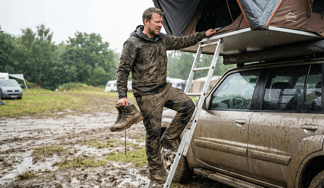 ❌ The Mud Struggle: Climbing straight into your tent brings dirt and moisture right into your sleeping bag.